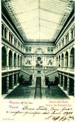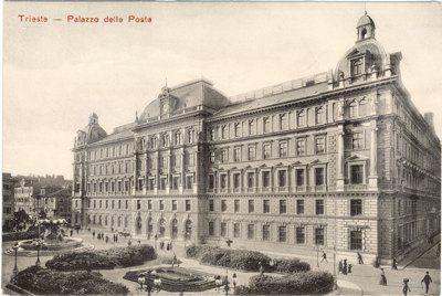 L'imponente palazzo venne costruito tra il 1890 e il 1894 su progetto dell'architetto viennese Friedrich Setz, sull'area in precedenza occupata dall'edificio della Dogana. Costruito dall'impresa Gregersen e Schwarz sotto la direzione dell'ingegnere Guido Levi, l'immobile costituisce un significativo esempio di architettura eclettica nell'ambito della tipologia comune agli edifici pubblici austriaci dell'epoca. Il palazzo venne concepito fin dall'inizio per ospitare sia gli uffici postali e telegrafici sia quelli della finanza, per cui all'interno è strutturato in due corpi distinti, con ingressi separati rispettivamente in piazza Vittorio Veneto e Largo Panfili. Sui prospetti laterali si aprono i portoni per il transito dei carri postali. All'ultimo piano della facciata principale sono collocate alcune statue. A coronamento della parte centrale della facciata vi è una copertura a cupola al centro della quale è collocato un abbaino delimitato da due erme e con un orologio. Cupole si ergono anche agli angoli della costruzione. All'interno si apre un atrio spazioso da cui parte, al centro, un grande scalone che da accesso al vestibolo superiore. Al primo e al secondo piano corridoi con arcate a crociera si affacciano sul vestibolo.