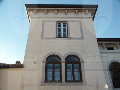Le facciate sono trattate ad intonaco liscio color rosa sui quattro lati. Sul fronte principale un bassissimo battipiede in pietra calcarea protegge l'attacco a terra dell'edificio da danneggiamenti accidentali. Un alto marcapiano quadro di colore uguale a quello della facciata separa le finestre del piano terra da quelle del primo piano. Il coronamento è costituito da un marcapiano quadro in pietra e una serie di fitte mensole a voluta poste a sostegno della banchina e interrotte regolarmente da fori rettangolari di aerazione del sottotetto. Sul fronte principale, tutti i fori architettonici sono archivoltati, provvisti di cornice in pietra calcara, con serramenti vetrati lignei verniciati bianchi a doppia anta a quattro specchiature con sopraluce e serramenti oscuranti esterni verniciati color testa di moro. Spiccano sull'avancorpo a tre livelli una bifora al primo piano e un foro rettangolare al piano secondo, affiancato da altri due tamponati. Sul prospetto ovest i fori architettonici rettangolari con serramenti vetrati lignei doppi, a doppia anta a sei specchiature, sono protetti da oscuranti esterni verniciati color testa di moro. Grondo e pluviali sono in metallo verniciato color testa di moro e scendono esternamente lungo le facciate laterali. Il manto di copertura è in coppi curvi rossi "uso Trieste". Internamente rifinito ad intonaco con abbassamento a smalto, presenta pavimentazioni varie dal tavolato grezzo, alle marmette di cemento e graniglia, fino alla pavimentazione in pietra calcarea bocciardata.