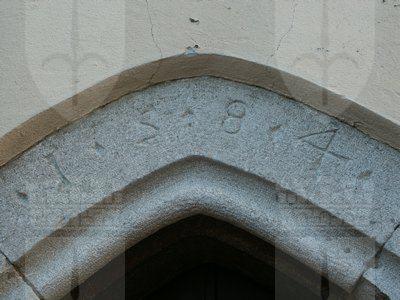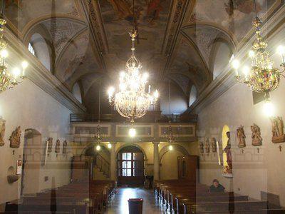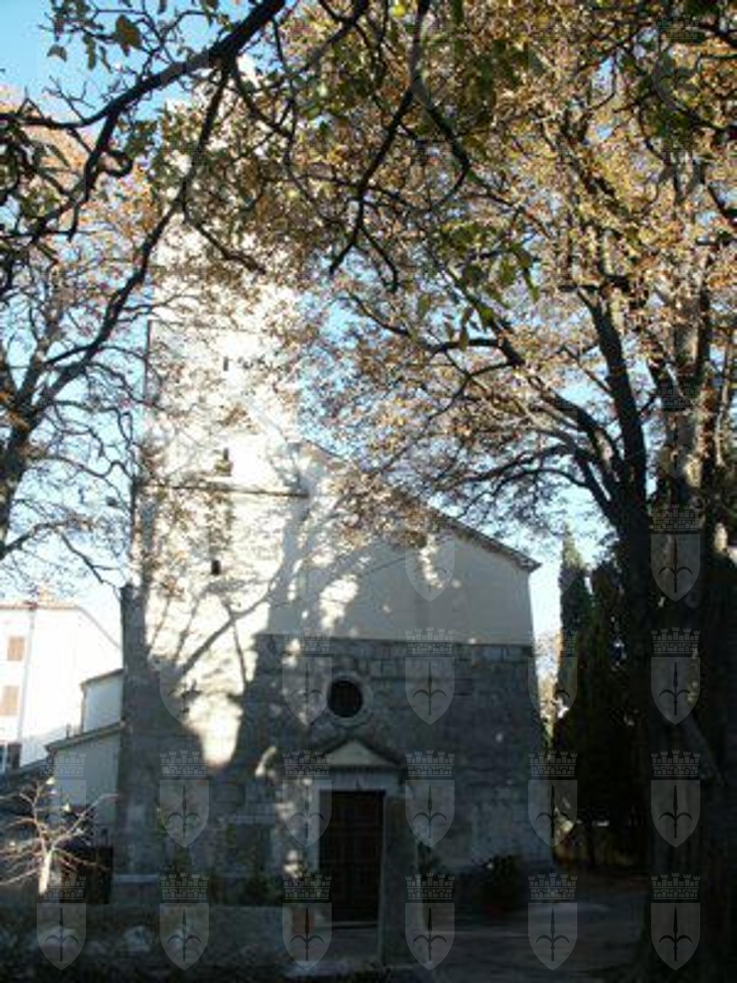 ISCRIZIONE (esterno) Sull'arco acuto dell'ingresso laterale è scolpita la data del 1584, presumibile data di edificazione della chiesa. ISCRIZIONE (esterno) Sull'architrave dell'ingresso principale si legge un'iscrizione dedicata al vescovo Rinaldo Scarlichio che consacrò nel 1628 l'edificio: "Antist(ite) et com(ite) Terg(estimo) Reinaldo Scarlichio an(n)o sal(utis) MDCXXVIII". EPIGRAFE (esterno) Su un concio a destra dell'ingresso principale si legge: "Anno D(omi)ni MDLXX/XIIII mensis Juni XIII / clavigari Marcus Boga/tac [...] Iacob Bosall [...]". AFFRESCO (interno) La volta sopra la navata, trattata a fresco da F. Ferlettig nel 1910, ospita la raffigurazione dell'Invenzione della Croce. STATUE (interno) L'altare maggiore è arricchito dalle statue marmoree raffiguranti S. Rocco, la Madonna, S. Giovanni Evangelista e S. Primo. AFFRESCO (interno) La volta dell'abside è decorata a fresco con la scena di Gesù nell'Orto. AFFRESCO (interno) Sulle pareti orientali delle cappelle laterali l'artista Antonio Jelo?in dipinse nel 1921 la scena della Liberazione di San Pietro e la raffigurazione della Sacra Famiglia. ELEMENTI ORNAMENTALI (interno) Sull'altare destro una pala decorata ad olio da una suora nel 1975 raffigura i Santi Pietro e Paolo, mentre sull'altare sinistro campeggia una statua lignea dedicata alla Madonna con Bambino. ELEMENTI ORNAMENTALI (interno) Alle pareti è raffigurata la Via Crucis in pannelli lignei a bassorilievo.