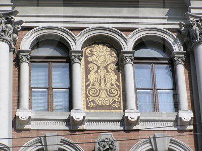 L'edificio, a cinque piani fuori terra, presenta una facciata ripartita verticalmente in tre sezioni. Il basamento presenta un rivestimento a bugnato mentre i piani superiori sono distinguibili per il fondo in finto mattone. La superficie del pianoterra e del primo piano è caratterizzata nella parte centrale da una leggera soprgenza, mentre nei piani superiori l'articolazione è messa in evidenza da semicolonne e lesene angolari. A movimentare la facciata superiore intervengono una serie di aperture a tutto sesto; dal terzo livello le finestre sono im preziosite da elegnati decorazioni monocrome a grottesca e da riquadri con festoni di foglie e frutta a rilievo di chiara ispirazione rinascimentale. Figure di putti danzanti spiccano alla base delle semicolonne centrali del piano nobile. Rilievo assumono i tre stemmi con soggetti coronati d'allora posti in facciata.