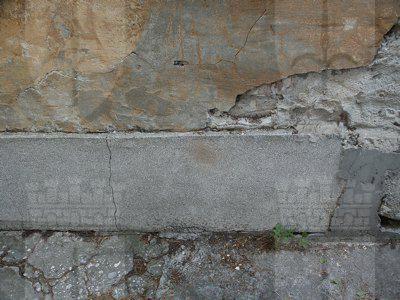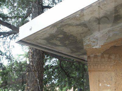 Un abbassamento in pietra artificiale protegge la parte inferiore della muratura rifinita su tutta la superficie ad intonaco liscio. I fori architettonici squadrati presentano cornici e davanzali in pietra artificiale, serramenti lignei verniciati bianchi e serrande esterne in lamiera zincata. La copertura piana con uno sporto di linda a protezione della muratura perimetrale, presenta manto in guaina catramata e scossalina perimetrale in lamiera zincata verniciata grigia.
