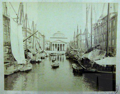 La zona delle antiche saline a ponente delle mura della città medievale, demolite, per volere dell'imperatrice Maria Teresa d'Austria nel 1749, cominciò ad essere bonificata già a partire dagli inizi del XVIII secolo concretizzando il progetto del suo totale interramento allorquando la sovrana cedette al Comune i fondi su cui erigere la futura città Teresiana. Il vasto terreno paludoso più vicino al mare era attraversato, all'epoca, da tre canali di diversa grandezza accessibili alla navigazione di piccolo cabotaggio messo a servizio delle saline: uno, detto del Vino o Piccolo, lungo un centinaio di metri interrato per motivi igienici nel 1816. Uno medio, corrispondente pressappoco all'attuale canale che dalla chiesa di S. Antonio Nuovo conduce fino al mare ed infine un terzo, più corto degli altri due. Quando si stabilì di bonificare l'area, si prese in considerazione il progetto di interrare il più piccolo, allargare il medio (rendendolo agibile ai bastimenti di stazza maggiore) e conservare il canale del Vino. Per ordine di Maria Teresa, il 14 ottobre 1756, il Canal Grande venne ampliato e dotato di una sponda murata sotto la direzione dell'architetto Matteo Pirona al costo di 90.000 fiorini. Inizialmente lungo le sponde furono piantati degli alberi, immantinente tolti per probabili motivi di ordine pratico, intralciando l'ormeggio dei bastimenti ed il transito delle merci. Largo 28,4 metri, il corso d'acqua era attraversato da due ponti di ferro mobili: il cosiddetto Ponte Verde e il più noto Ponte Rosso, che metteva in comunicazione l'omonima piazza con l'allora Via delle Poste. Nel 1769 venne eretta, nel tratto antistante la parte terminale del Canal Grande, una chiesa barocca dedicata a S. Antonio che, come ci ricorda il Generini, fu costruita con il "peculio di pii benefattori ad iniziativa dei fedeli dell'antica confraternita dei nobili addetta alla chiesa volgarmente nota per S. Antonio vecchio". Lo spazio compreso tra il nuovo fabbricato ed il canale prese quindi il nome di Piazza S. Antonio. La chiesa fu restaurata nel 1784 e, ritenuta non più consona alle mutate situazioni demografiche, fu demolita e sostituita, nel 1827, con l'attuale edificio progettato dall'architetto Pietro Nobile. Il nuovo tempio, consacrato dal vescovo Bartolomeo Legat, fu officiato per la prima volta il 3 aprile 1842, ma completato appena nel 1849. Allorquando i lavori di fabbricazione dell'edificio erano in fase di ultimazione, si decise di portare a termine anche il progetto di sostituzione del vecchio selciato nella parte antistante la chiesa. La lastricazione della Contrada di S. Antonio avvenne, infatti, in periodi successivi, tra il 1820 ed il 1835, allorquando tutta l'originaria pavimentazione della città venne sostituita con delle pietre più regolari ed ordinate. Nel 1820 Il Consiglio comunale aveva perfino avvallato un progetto di modifica delle ruote dei carri addetti al trasporto delle merci da un magazzino all'altro, di modo che la pavimentazione del nuovo lastricato non potesse esser compromessa. Nel 1824 il Comune decretò anche la costruzione di una ringhiera di ferro battuto da sistemarsi sulla testa del canale, proprio dirimpetto alla facciata della chiesa. Ma la demolizione del vecchio edificio e il notevole rallentamento dei lavori del nuovo, di fatto, condizionarono l'effettiva selciatura dell'area prospiciente la chiesa stessa che, ingombra delle travature di legno a protezione del nuovo fabbricato, impedirono per un bel pezzo la possibilità di posare le nuove pietre. Nel 1832 parte dei lavori dovevano però essere ultimati, se è vero che il Comune dovette fare espressa richiesta all'imprenditore Valentino Valle, responsabile della pavimentazione, di abbattere, sulla Piazza del Ponterosso, il casotto eretto per "comodo delli lavori da tagliapietre della nuova chiesa di S. Antonio, casotto lì da quasi 5 anni". Le "Condizioni d'incanto" del 1830, relative alla pavimentazione della piazza precisavano, inoltre, che le pietre del vecchio selciato non dovevano essere buttate via, ma trasportate fino al Borgo Giuseppino, sulla riva del mare, per "proseguire il nuovo quais". Nel 1934 si diedero avvio a quei lavori di interramento del canale che portarono Piazza S. Antonio ad assumere l'odierna fisionomia: una fontana centrale al posto dell'acqua e sei aiuole fiorite da contorno. Utilizzando il materiale proveniente dalle demolizioni di Cittavecchia, l'ultimo tratto dell'antico corso d'acqua piano piano scomparve. Il nuovo spazio che ne derivò prese il nome di Piazza Umberto I. Tra le curiosità degne di nota figura quella dell'interramento, all'interno del canale, di una torpediniera austriaca che, trovandosi lì ormeggiata da tempo e ormai fuori uso, venne ricoperta dal materiali di riporto, una volta adagiatasi su un fianco. Giace ora sotto la fontana, testimone silente di un passato ormai dimenticato. Dando le spalle alla chiesa, sul lato sinistro vale la pena di sottolineare la presenza di un altro edificio di interesse storico e sociale di non secondaria importanza: il Caffè Stella Polare. Nel 1900 a causa dei lavori di ristrutturazione della Casa della Comunità Serbo ortodossa, il Caffè, lì ospitato, venne chiuso, si pensò allora di erigere un fabbricato provvisorio, in cemento e legno, che fu ubicato proprio di fronte alla chiesa nello spazio davanti al canale. Ebbe forme secessioniste e durò alcuni anni sino all'inaugurazione del nuovo palazzo progettato dall'ingegner C. Cambiario nel 1902. Durante gli anni Quaranta e Cinquanta la piazza fu utilizzata come parcheggio autovetture.