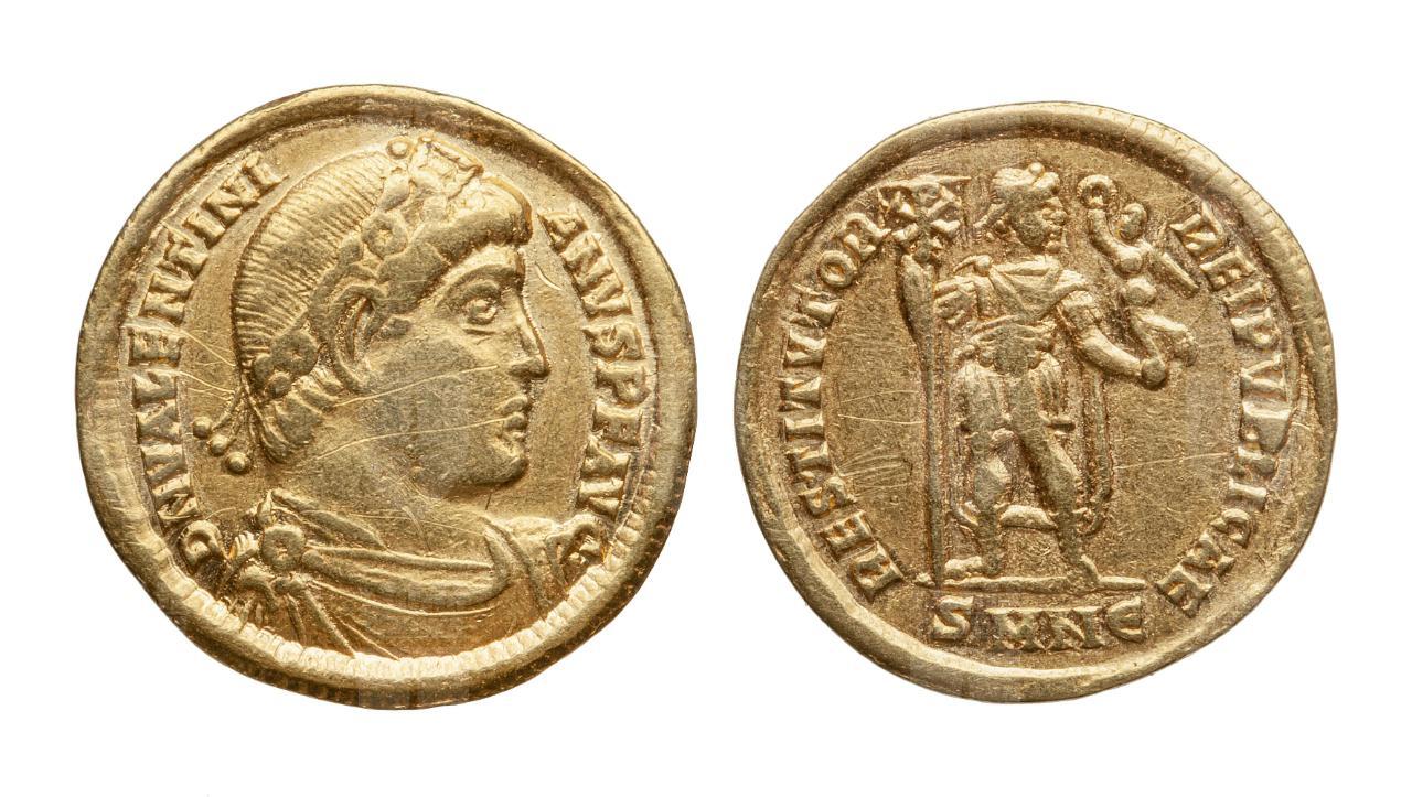 Busto dell’imperatore di profilo, rivolto a destra, con diadema sul capo, capelli corti e lisci e spalle rivestite dalla toga.; D N VALENTINIANUS P F AUG (Il nostro signore Valentiniano, pio, felice, Augusto)