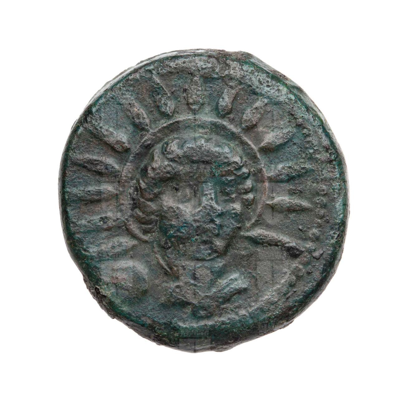 Busto frontale drappeggiato del Sole. A sinistra: un globetto.