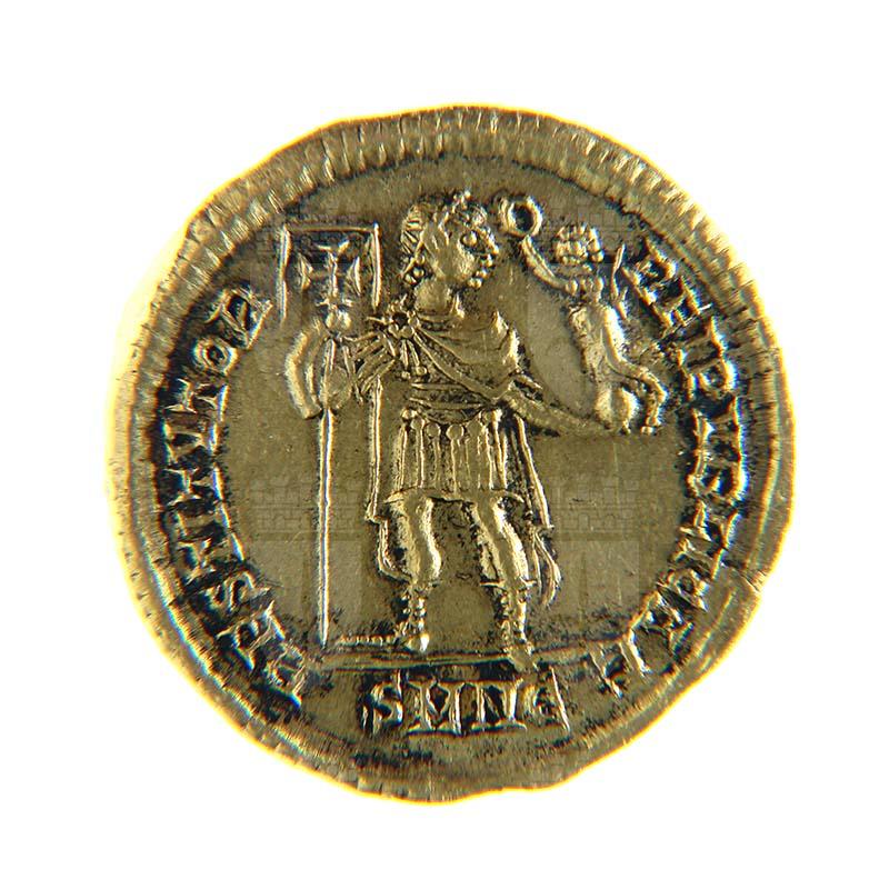 Imperatore stante a destra con labaro e vittoria; RESTITVTOR REIPVBLICAE, in esergo SMNE