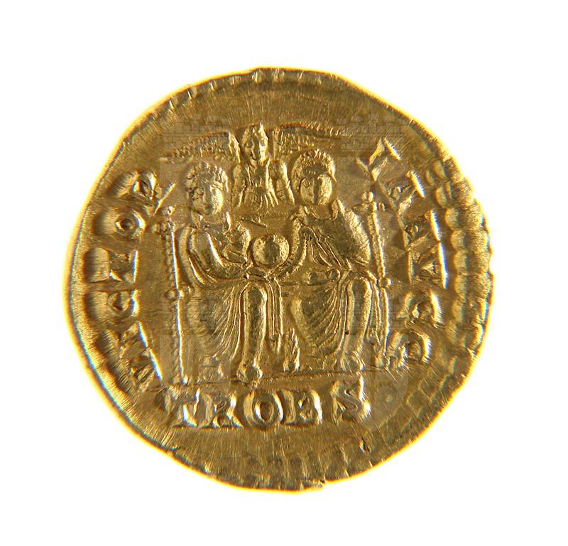 Graziano e Valentiniano assisi; VICTOR IAAVGG, in esergo TROBS