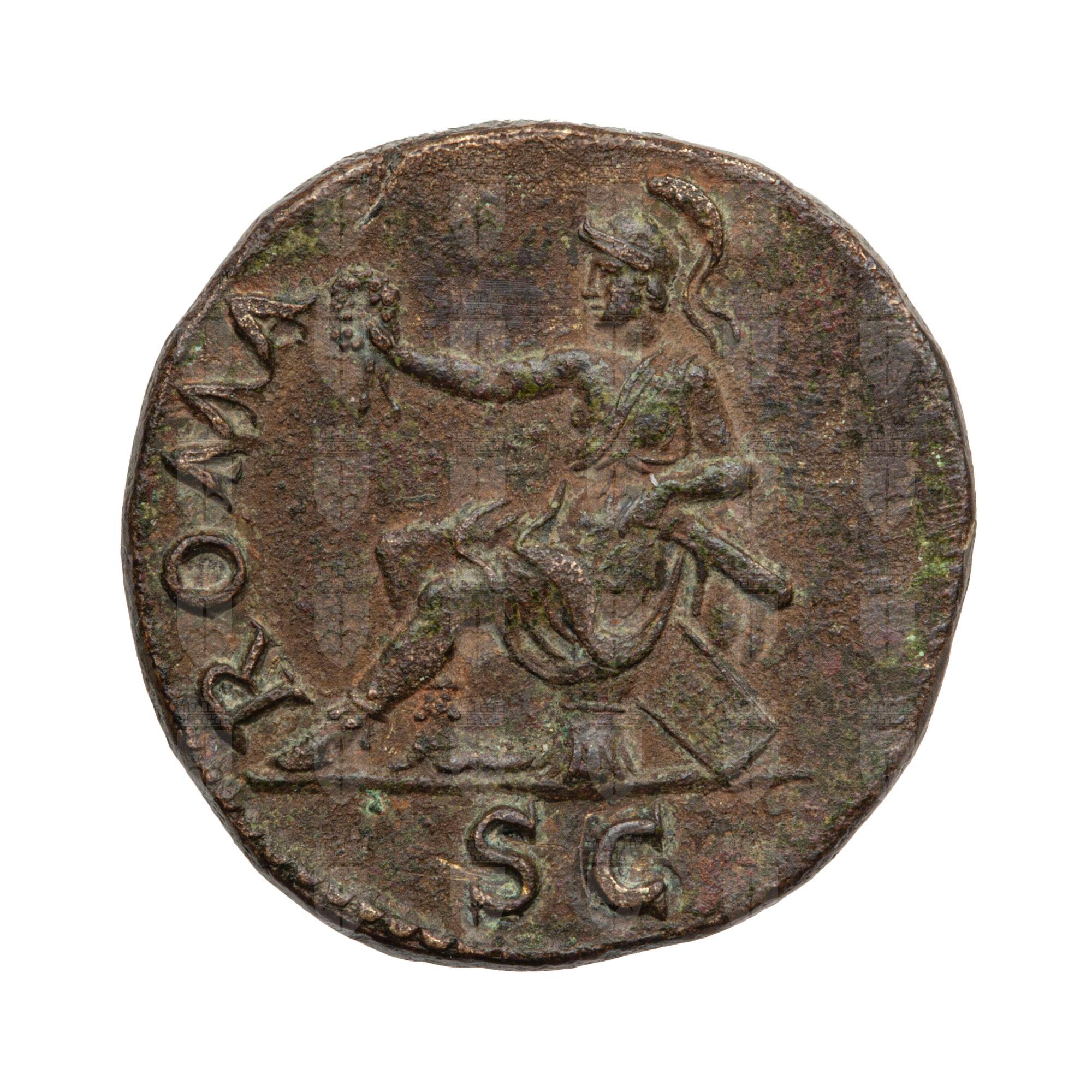 Personificazione di Roma seduta con elmo, spada (parazonium), e scudo poggiato dietro il sedile; con una mano regge una corona d’alloro.;