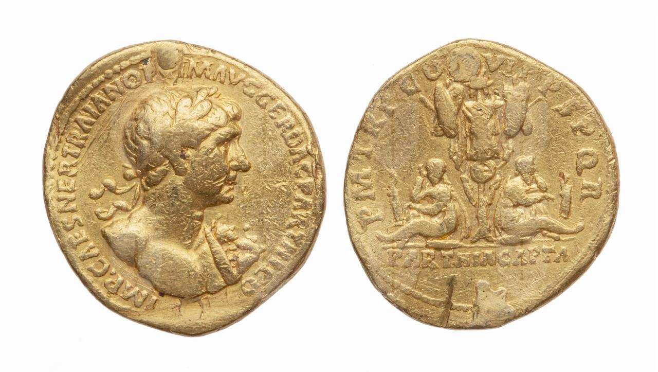 Aureo con testa di Traiano / Trofeo d'armi tra due prigionieri
