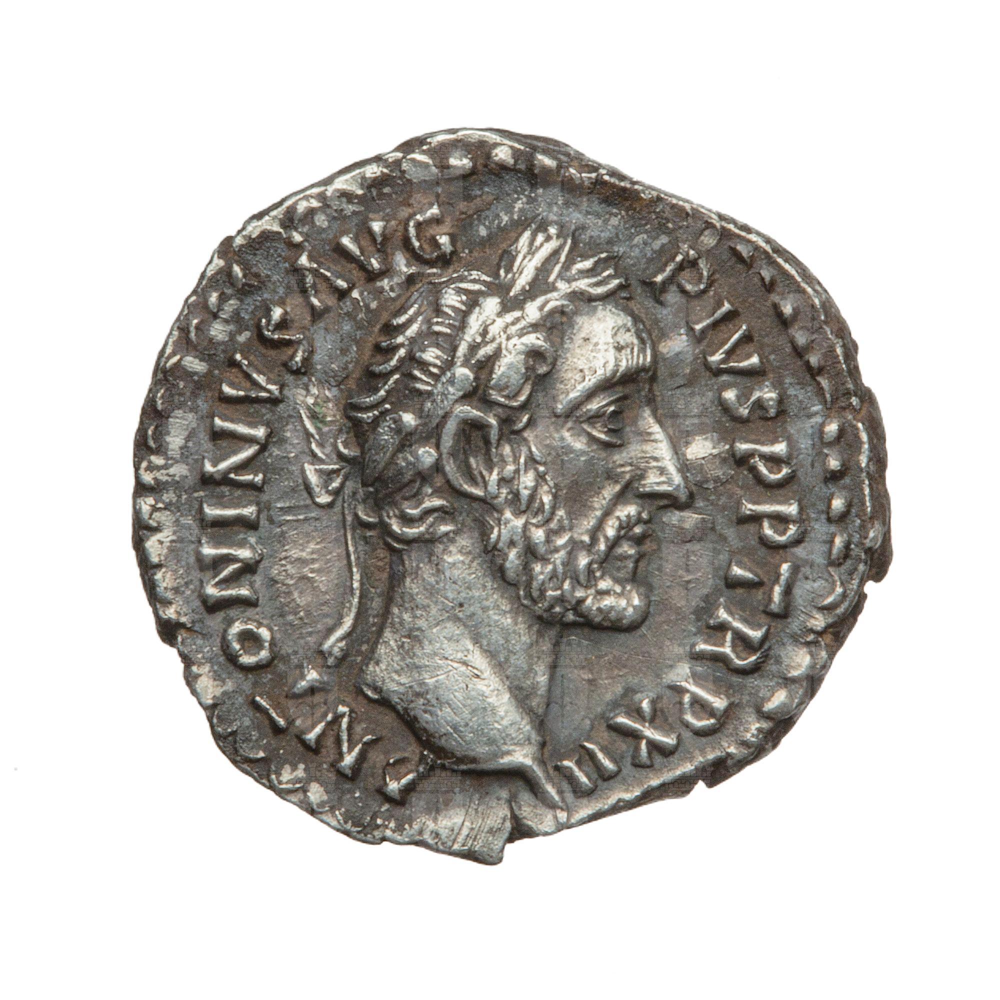 Volto dell’imperatore di profilo, rivolto a destra, con corona d’alloro, capelli e barba corti; il naso è leggermente aquilino.; ANTONINUS AUG PIUS PP TR P XII (Antonino Augusto Pio, padre della patria, tribuno della plebe per la dodicesima volta)