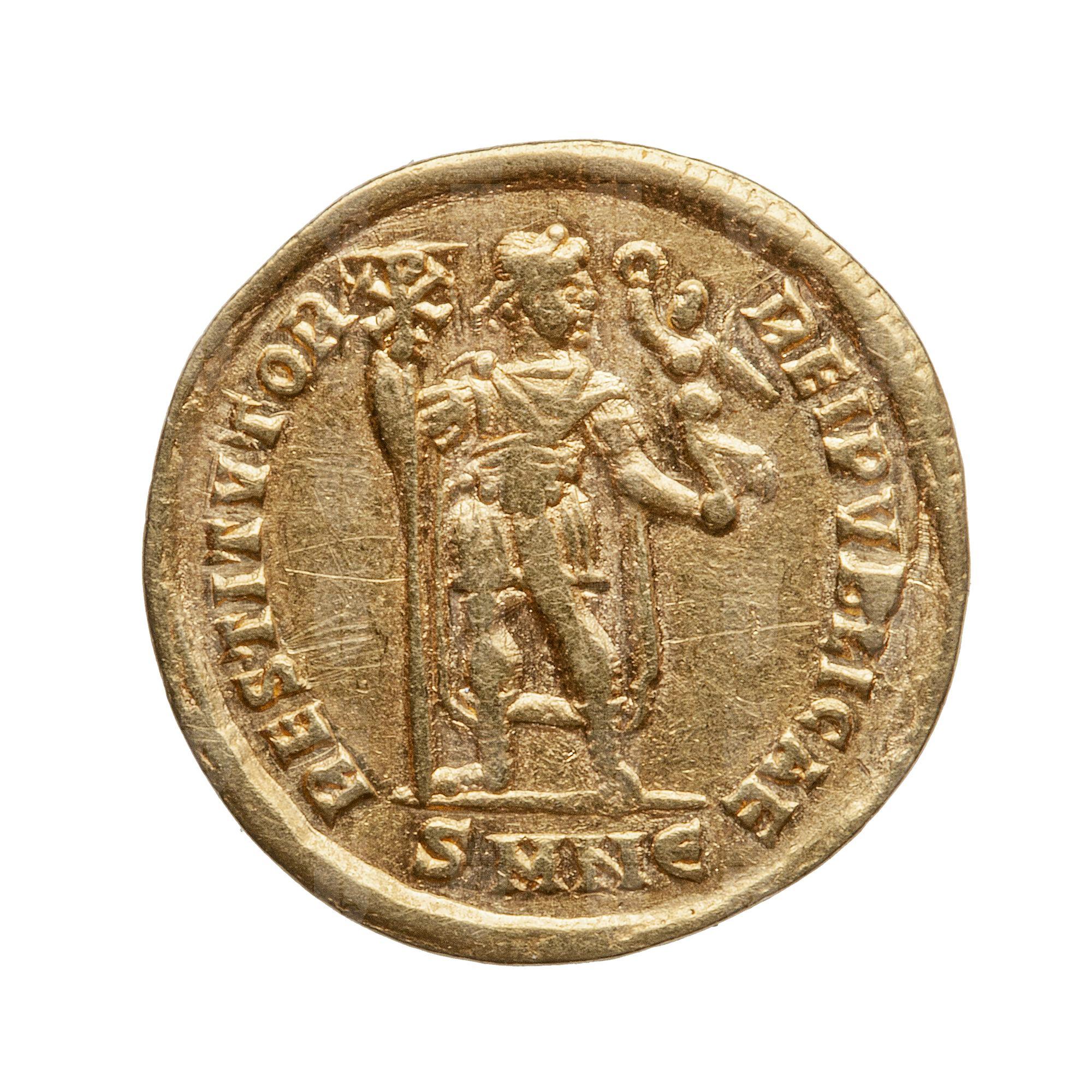 Figura dell’imperatore, in veste di soldato, che con una mano regge un labaro su cui campeggia il Cristogramma, con l’altra una piccola Vittoria alata su un globo.; RESTITUTOR REIPUBLICAE (restauratore della Repubblica). All’esergo: SMNE (marchio di zecca)
