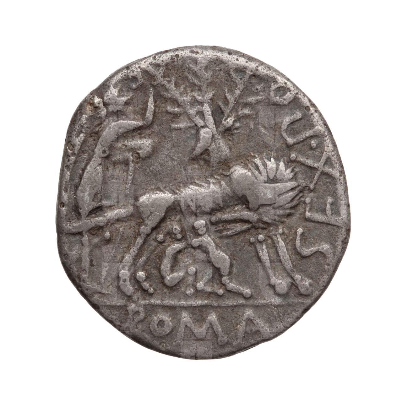 La lupa a destra,con la testa volta all’indietro, allatta i gemelli. Dietro è presente il ficus Ruminalis, ovvero il fico selvatico nei pressi del Tevere dove avvenne l’allattamento, con due uccelli sui rami. A sinistra: Faustulus, il pastore che trovò Romolo e Remo,appoggiato a un bastone; a destra: FOSTLVS.: In esergo : SEX. PO.: ROMA