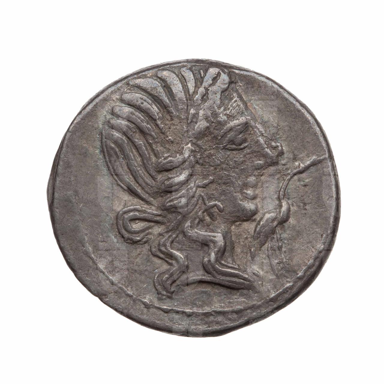 Testa diademata di Pietas (la Pietà) a destra. Davanti: una cicogna.