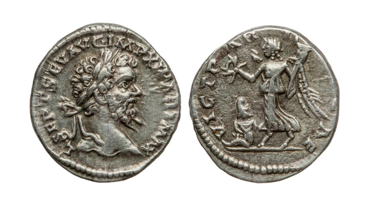 Testa dell’imperatore di profilo, rivolto a destra, con corona d’alloro sul capo, capelli corti ricci, caratterizzato da una lunga barba riccioluta e dal naso dritto.; L SEPT SEV AUG IMP XI PART MAX (Lucio Settimio Severo Augusto, dotato di imperium per l’undicesima volta, massimo vincitore dei Parti)