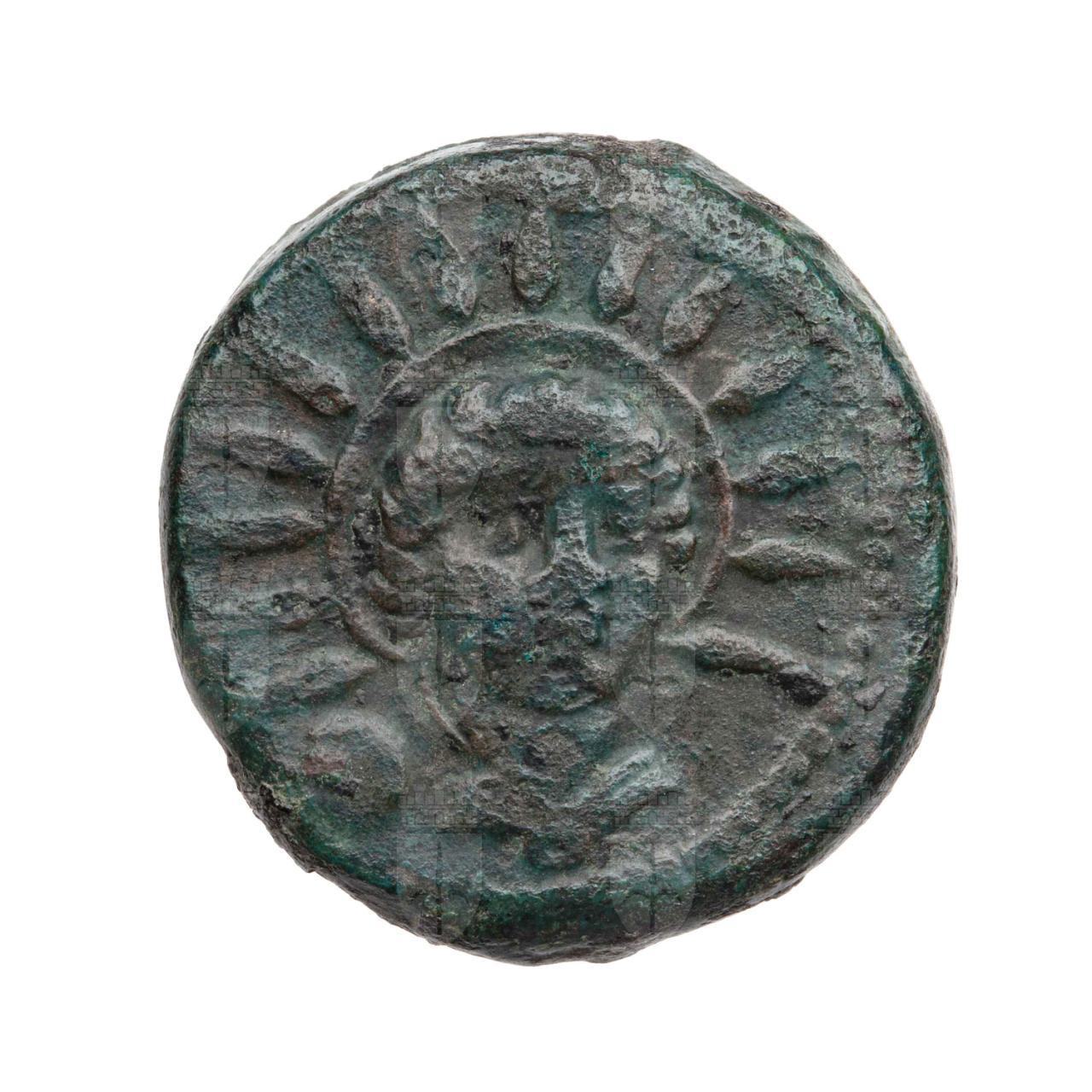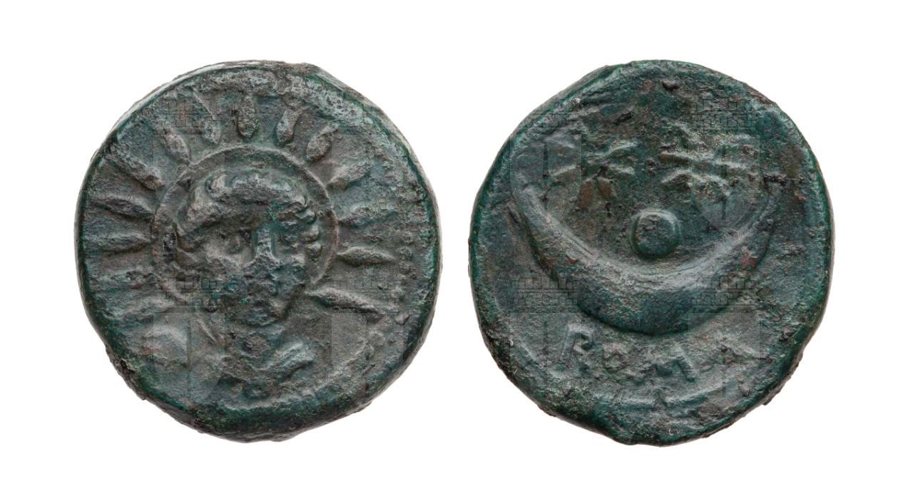 Busto frontale drappeggiato del Sole. A sinistra: un globetto.