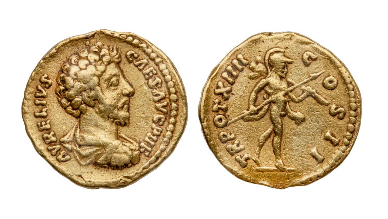 Busto dell’imperatore di profilo, rivolto a destra, senza corona ma con capelli e barba ricci; le spalle sono coperte dalla toga.; AURELIUS CAES AUG PII F (Aurelio Cesare, figlio dell’Augusto Pio)