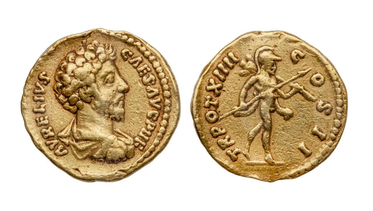 Busto dell’imperatore di profilo, rivolto a destra, senza corona ma con capelli e barba ricci; le spalle sono coperte dalla toga.; AURELIUS CAES AUG PII F (Aurelio Cesare, figlio dell’Augusto Pio)