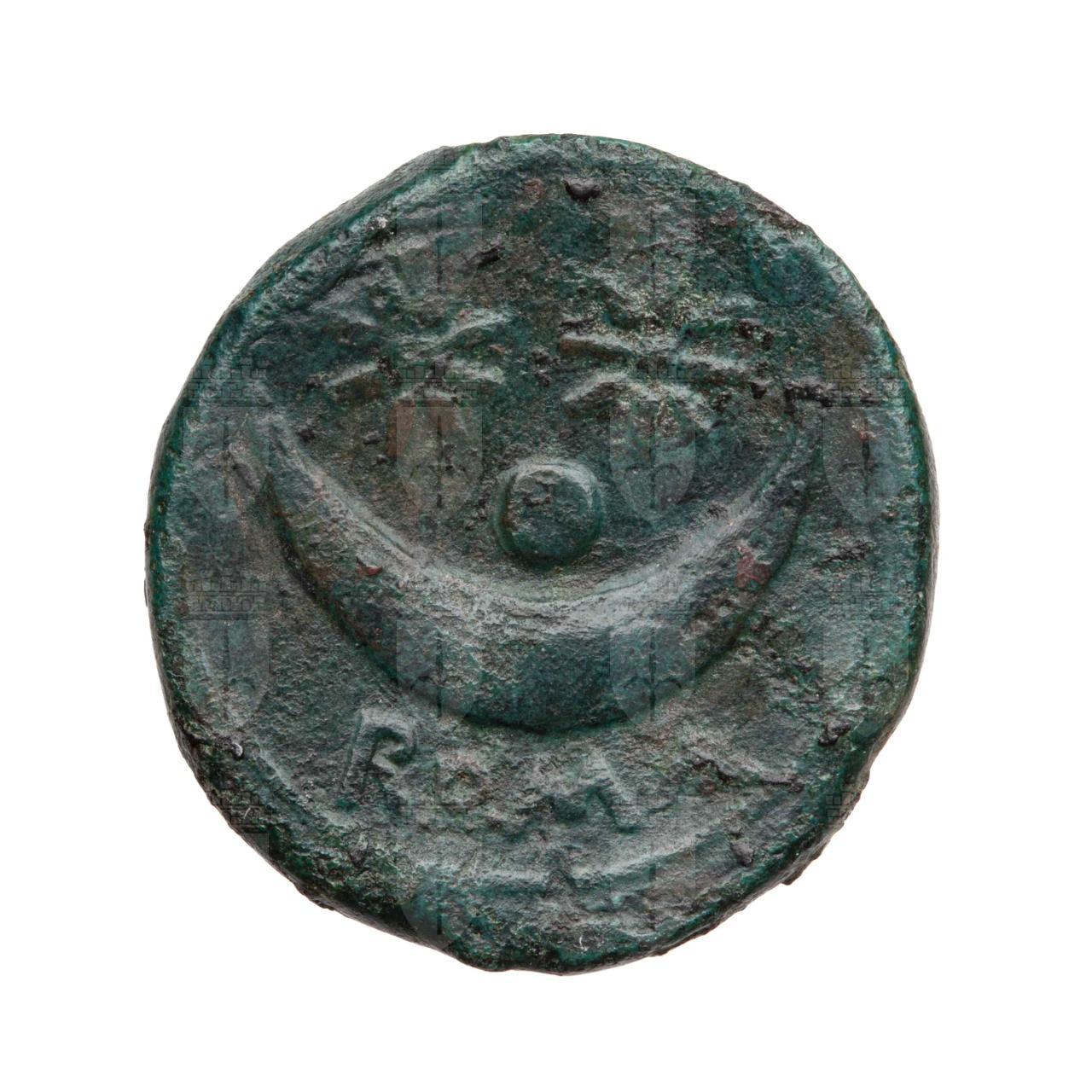 Busto frontale drappeggiato del Sole. A sinistra: un globetto.