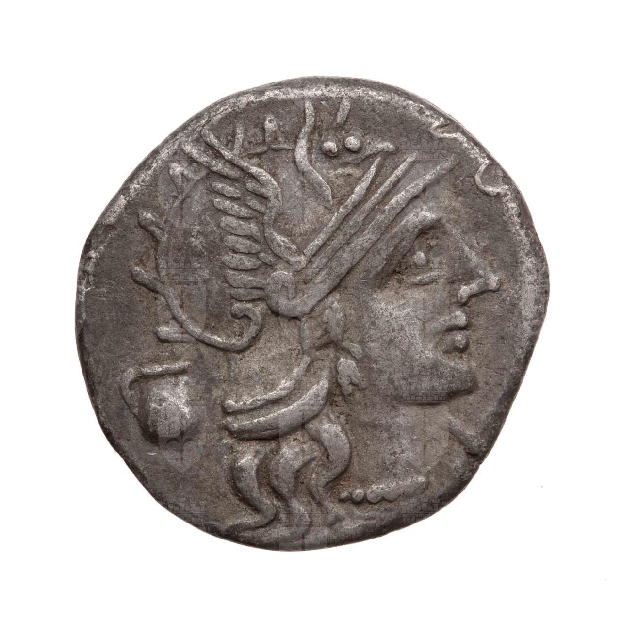 Testa elmata di Roma a destra. Dietro: una brocca; davanti:segno di valore X.