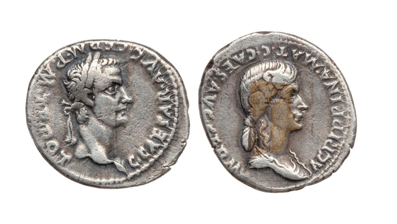 Ritratto di Agrippina, madre di Caligola: il volto di profilo è ritratto verso destra.; in senso antiorario: AGRIPPINA MAT C CAES AUG GERM (Agrippina, madre di Gaio Cesare Augusto Germanico)