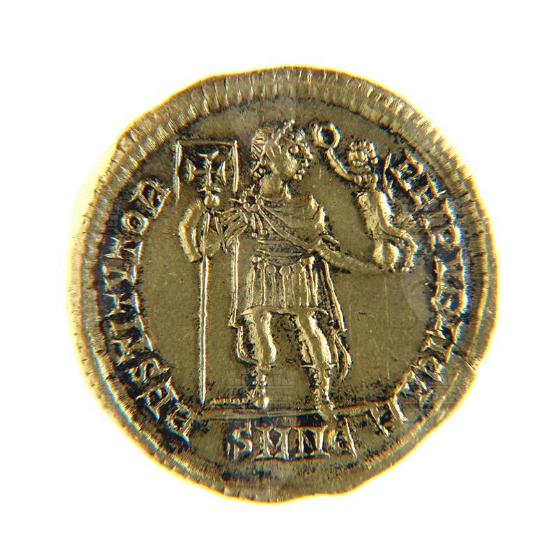 Imperatore stante a destra con labaro e vittoria; RESTITVTOR REIPVBLICAE, in esergo SMNE