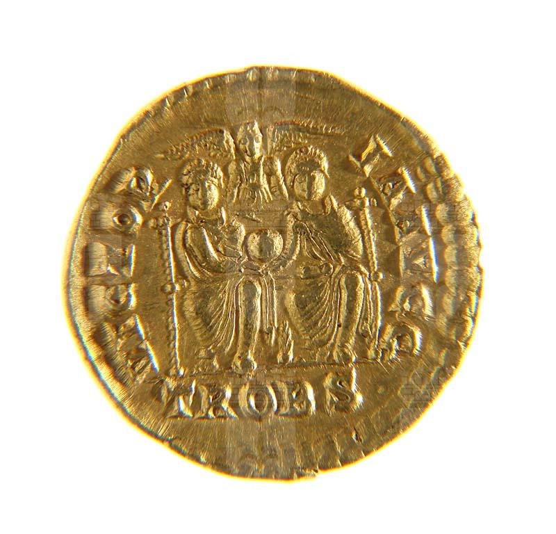 Graziano e Valentiniano assisi; VICTOR IAAVGG, in esergo TROBS