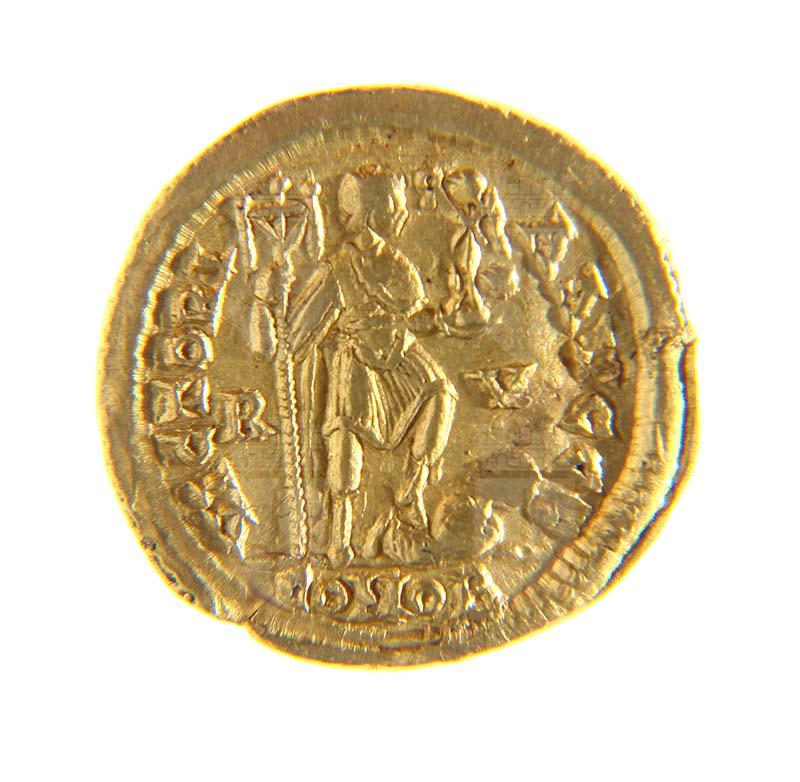 Imperatore a destra con labaro e Vittoria che calpesta un prigioniero; VICTORI AAVGGG, nel campo R V, in esergo CONOB