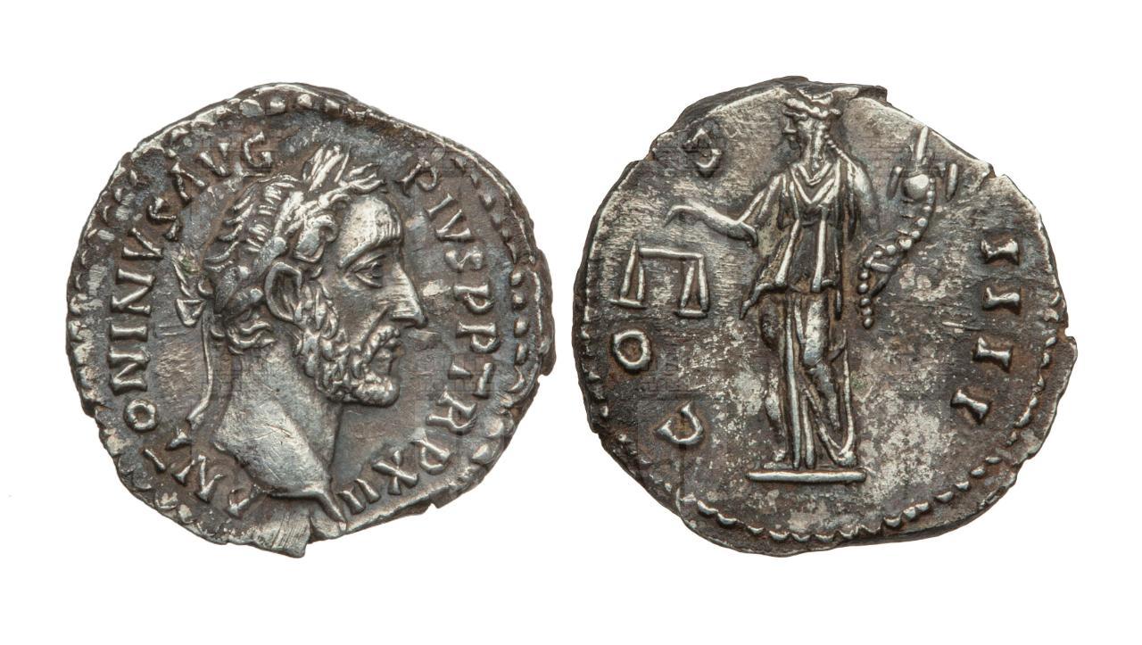 Denario con testa di Antonino Pio / Personificazione della Giustizia