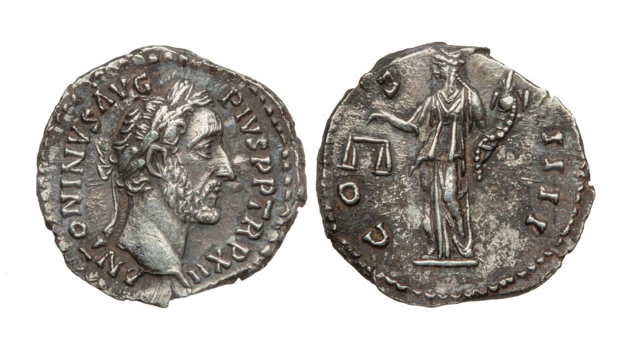 Denario con testa di Antonino Pio / Personificazione della Giustizia