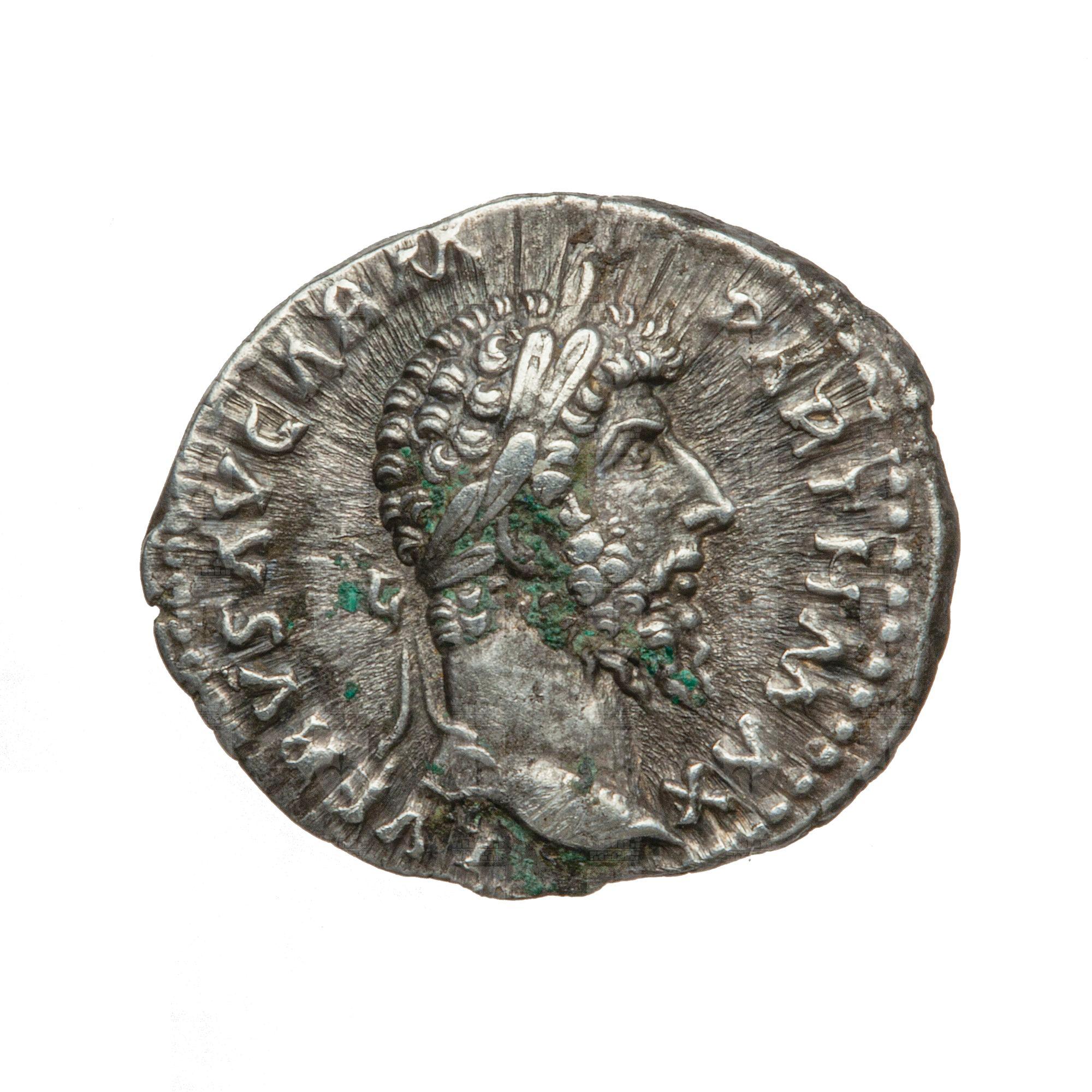 Testa dell’imperatore di profilo, rivolto a destra, con corona d’alloro sul capo, capelli corti ricci, caratterizzato da una lunga barba riccioluta e dal naso aquilino.; L VERUS AUG ARM PARTH MAX (Lucio Vero Augusto, vincitore massimo degli Armeni e dei Parti)
