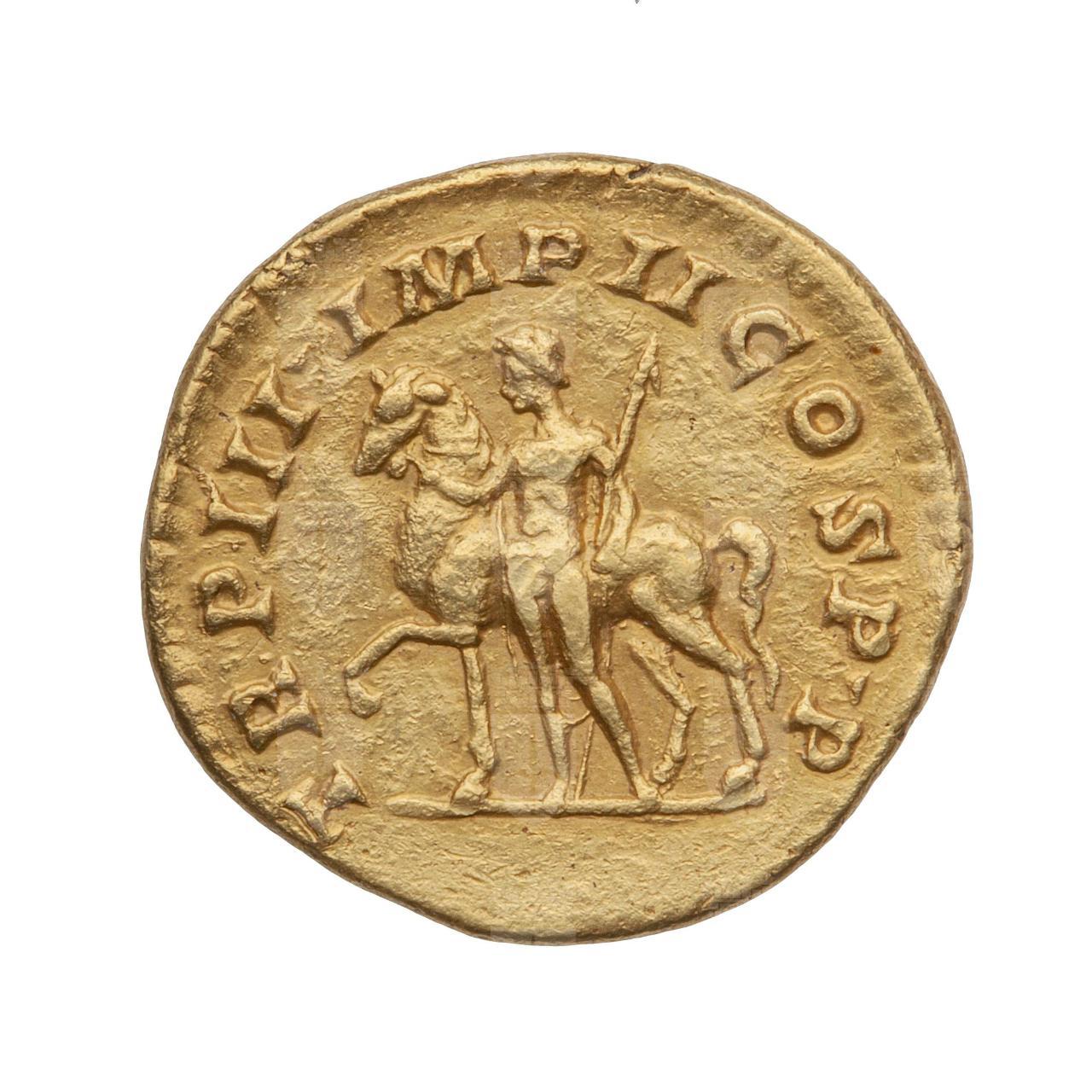 Figura di Castore che regge una lancia con una mano e con l’altra conduce un cavallo.; TR P III IMP II COS PP (tribuno della plebe per la terza volta, dotato di imperium per la seconda volta, console, padre della patria)