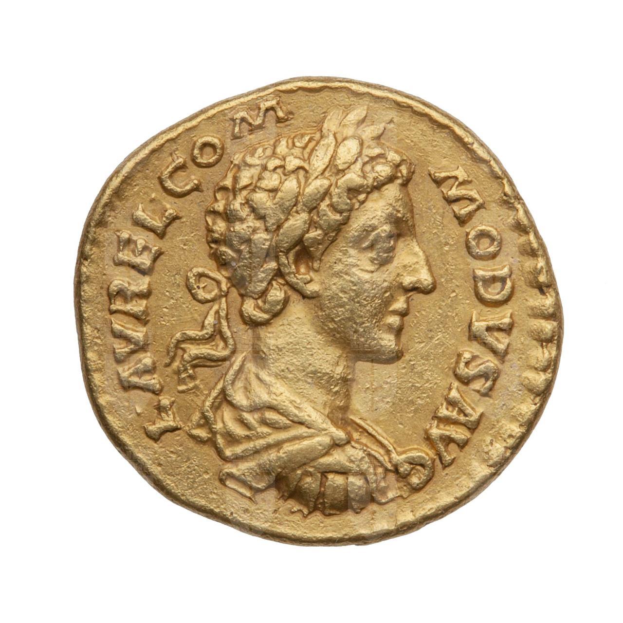 Busto dell’imperatore di profilo, rivolto a destra, con corona d’alloro sul capo, capelli corti ricci, e con le spalle coperte dalla corazza.; L AUREL COMMODUS AUG (Lucio Aurelio Commodo Augusto)