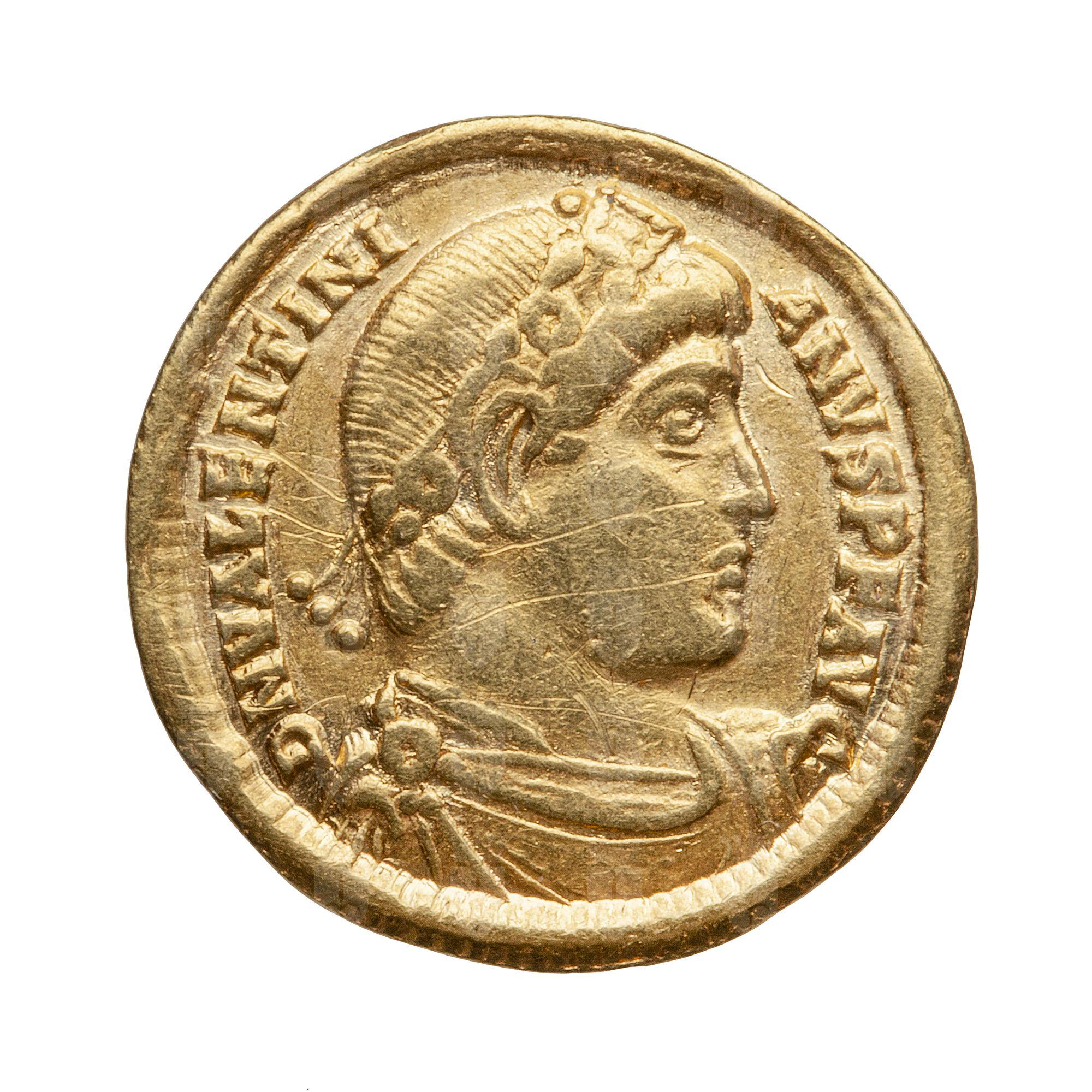 Busto dell’imperatore di profilo, rivolto a destra, con diadema sul capo, capelli corti e lisci e spalle rivestite dalla toga.; D N VALENTINIANUS P F AUG (Il nostro signore Valentiniano, pio, felice, Augusto)