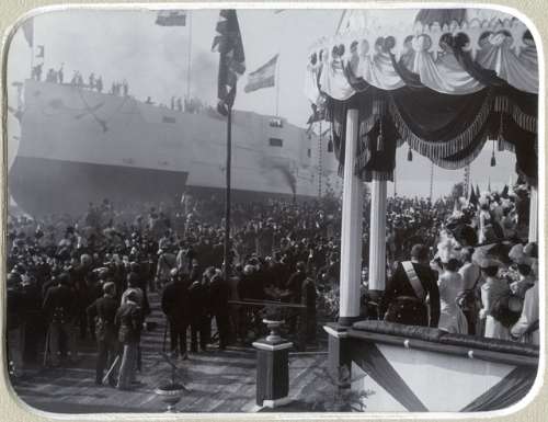 Francesco Ferdinando d'Asburgo con la moglie Sophie Chotek e il vescovo Andrea Karlin : varo della corazzata Tegethoff : 21 marzo 1912