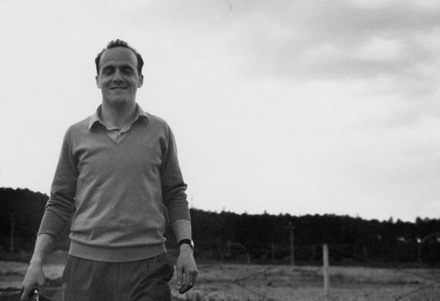 Ugo Borsatti su un prato con la sua Rolleiflex