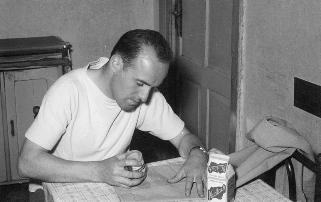 Ugo Borsatti intento in lavori di smacchiatura e rammendo pantaloni