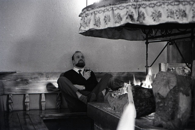 Ugo Borsatti con una faccia buffa e la sua macchina fotografica Rolleiflex con flash in primo piano
