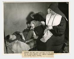 Suora rammenda gli abiti degli orfani