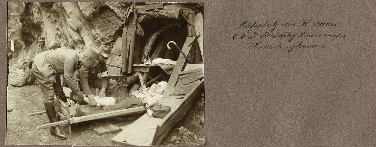 Hilfsplatz des 3. Baons : A. A. Dr. Rudofsky Konrad vor der Hindenburgkaverne