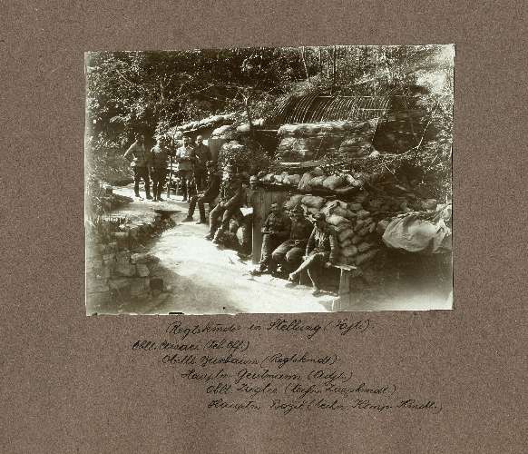 Regtskmdo in Stellung (Fajti) : Oblt. Casari (Tel. Off.), Obstlt. Buschaum (Regtskmdo), Hauptm. Gerstmann (Adjt.), Oblt. Ziegler (techn. Zugskmdt.), Hauptm. Bozic (techn. Komp. Kmdt.)