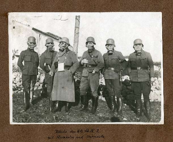 Kmdo des k.k. Sch. R. 2 mit Sturmhelm und Gasmaske