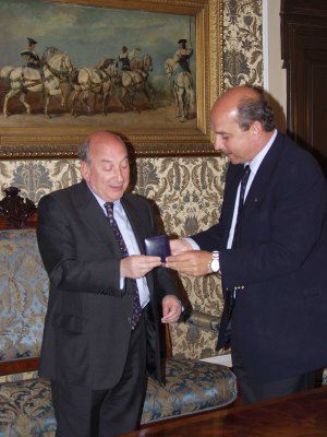 Il sindaco Roberto Dipiazza consegna il sigillo trecentesco della Città di Trieste al Questore Alessandro Fersini che si accomiata dalla Città : Trieste : 2002