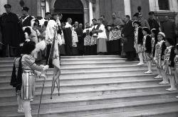 Fossalon : Posa prima pietra della chiesa e comizio del ministro Colombo (DC)