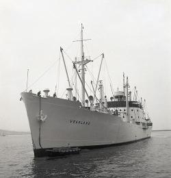 Arrivo e scarico caffè nave Vegaland. Nave da guerra