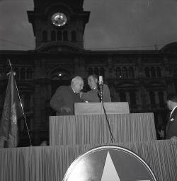 Comizio Carlo Delcroix (Partito Monarchico) in piazza Unità
