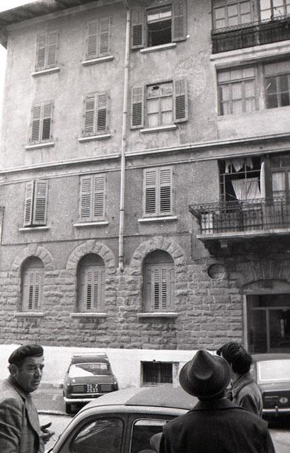 Esterno stabile 4 piani (polizia e curiosi che guardano)