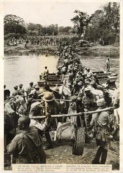 Truppe Americane e Cinesi su un ponte di barche improvvisato attraversano il fiume Mogaung