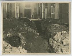Trieste, Via S. Giusto : Restauri marzo 1931, scavi nella navata sinistra. Tombe e muri romani. Affresco con madonna all'ultimo pilastro.