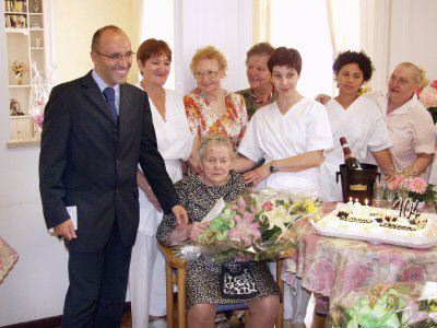 104. compleanno della signora signora Teresa presso la Casa di Riposo Senilità Anni Verdi : festeggiamenti : Trieste : 2002