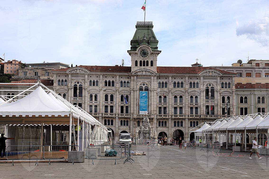 Preparazione degli stand per la Barcolana 57 in piazza dell'Unità d'Italia