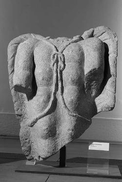 Stele con due mani alzate e la legenda greca osios kai dicaios da parte di Lucifera in marmo